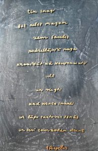 Dainis Gudovskis. Kompozīcija – Jāņa Rokpeļņa dzejas rindas uz stikla.