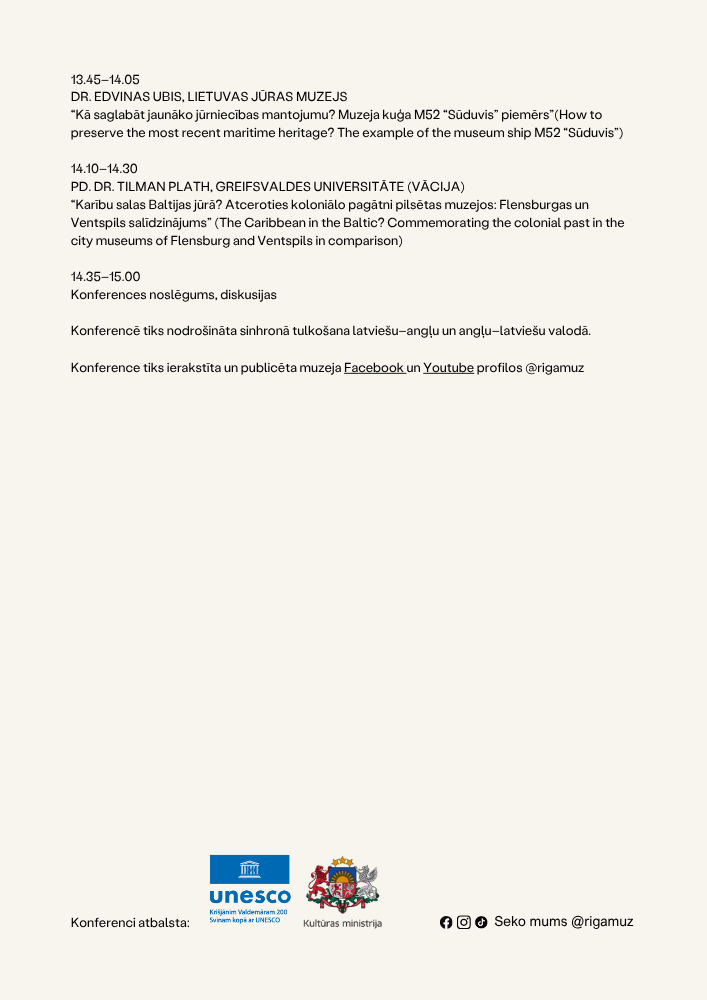 Pd. Dr. Tilman Plath, Greifsvaldes Universitāte (Vācija) “Karību salas Baltijas jūrā? Atceroties koloniālo pagātni pilsētas muzejos: Flensburgas un Ventspils salīdzinājums” (The Caribbean in the Baltic? Commemorating the colonial past in the city museums of Flensburg and Ventspils in comparison)