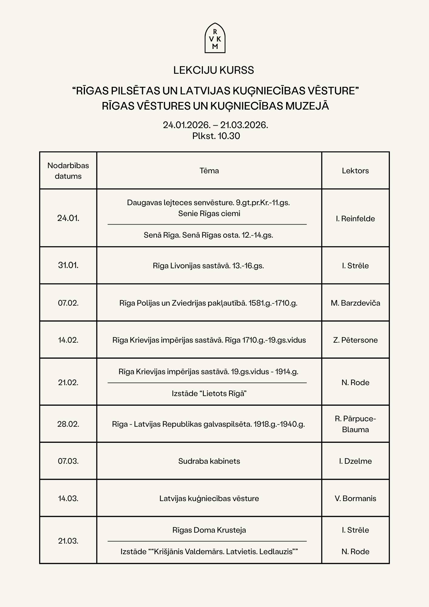 Rīgas vēstures un kuģniecības muzejs aicina gidus un vēstures interesentus piedalīties lekciju – ekskursiju ciklā „Rīgas pilsētas un Latvijas kuģniecības vēsture”, kas notiks no 2026. gada 24. janvāra līdz 21. martam, sestdienās, plkst. 10.30, Rīgas vēstures un kuģniecības muzejā (Palasta iela 4).