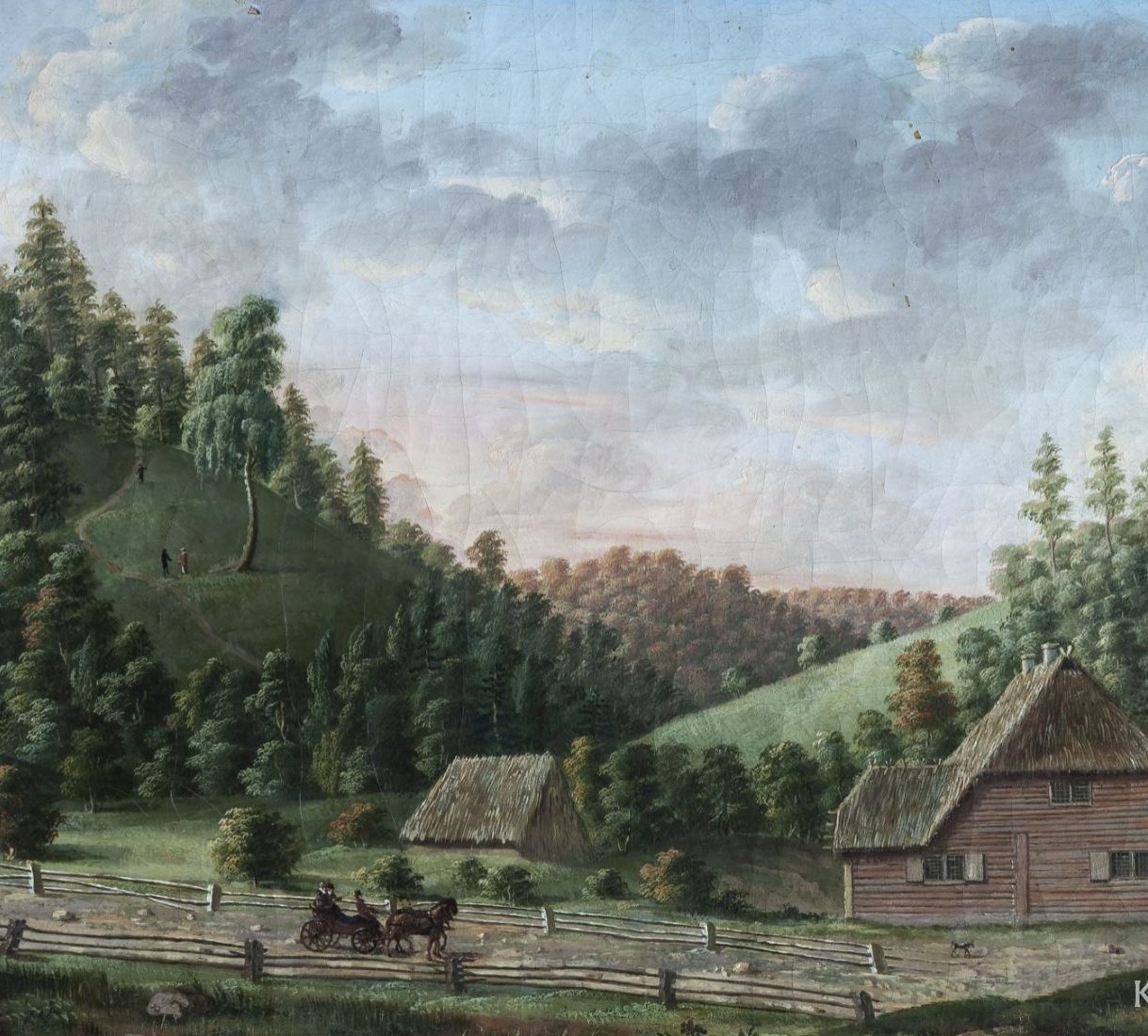 Lorupes muižas apkārtnes ainava Vidzemes Šveicē (Ansicht der Gegend von Kronenberg in livländischen Schweitz). Pēc Johana Vilhelma fon Krauzes skices gleznojis Karls Traugots Fehelms. Pirms 1816. gada. Audekls, eļļa. 40 x 58 cm.