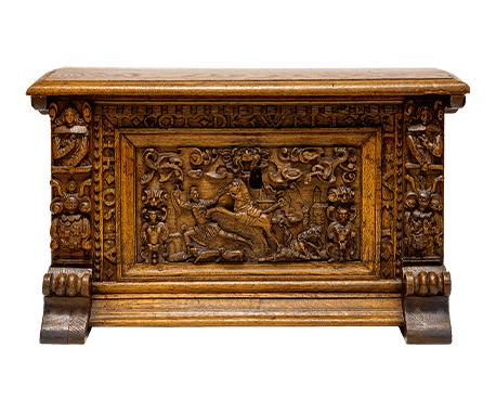Rīgas galdnieku cunftes lāde. Ozolkoks, metāls. 16. gs. Rīgas vēstures un kuģniecības muzeja krājums. Viens no 20 muzeja krājuma artefaktiem, kas izmantots “Senatnes loterijas” biļešu dizainā.