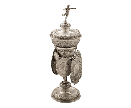 Rīgas cimdinieku amata zeļļu pokāls ar vāku un 13 piekariņiem. Sudrabs. 1685. gads. Rīgas vēstures un kuģniecības muzeja krājums. Viens no 20 muzeja krājuma artefaktiem, kas izmantots “Senatnes loterijas” biļešu dizainā.
